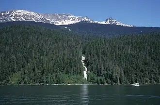 Azure Lake is ringed by peaks which rise about 1,800 m (5,906 ft) above its shoreline. North of the lake are Mount Huntley, Batoche Peak, Tryfan Mountain, and Buchanan Peak. Garnet Peak, Wells Gray Park's third highest mountain, rises north of Tryfan, but is not visible from anywhere on the lake. South of the lake are Zodiac Mountain and Azure Mountain. East of the lake's upper end is Mount Hogue. The deeply incised valley of Azure Lake was carved by glaciers during past Ice Ages resulting in rugged and steep shorelines. Hanging valleys are seen along both sides of the lake and there are waterfalls on nearly every tributary stream; Garnet Falls, Ludtke Falls, Crystal Falls, Roostertail Falls, and Rainbow Falls are the most notable.[2]