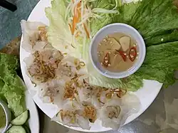 Bánh bao bánh vạc (also called white rose dumplings) are a regional specialty of Vietnamese cuisine unique to Hội An. The rice paper is translucent and wrapped to resemble a flower shape (the origin of the name "white rose"). It is said to be made with water from a certain well in Hội An, hence this dumpling is not found anywhere else.[1][2] The filling is prepared with a mix of shrimp, mushrooms, bean sprouts and spring onions. The dough is made by mixing rice flour with water and pounding the mixture in a mortar, and its preparation of the dough is rumored to be a family secret. The full meal bánh bao bánh vạc consists of seven bao style dumplings filled with shrimp paste, and three shell-shaped vac dumplings filled with shredded vegetables. The finished dish is topped with fried shallots and served with nước mắm chấm (sweetened fish sauce flavored with sugar, chillis, garlic and lime).[3]