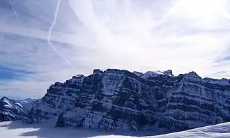 The Glärnisch is a mountain massif of the Schwyz Alps, overlooking the valley of the Linth in the Swiss canton of Glarus. It consists of several summits, of which the highest, Bächistock, is 2,915 metres above sea level. Until 2013, the highest point was considered to be an unnamed point with a summit cross at 2,914 metres (until 2013: 2'915 metres). The other main summits are Vrenelisgärtli ("Verena's Little Garden" at 2,904 metres) and the Ruchen (2,901 metres).