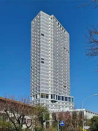 The tower was designed by Burkard Meyer Architekten and is located in Ostermundigen. The tower shares the residential function with the hotel function, the latter occupying the first four floors of the building. The ninth floor displays a restaurant with a terrase used for overlooking and as an observation deck.[5] The building houses a total of 152 apartment units. On the first 18 floors, the units are distributed as five per floor,while at the top nine floors, only four but larger apartments per floor are given.[6]