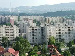 Békásmegyer (German: Krottendorf) is a neighbourhood in Budapest, Hungary. It belongs administratively to the 3rd District. Békásmegyer consists of two different parts, a huge high-rise housing estate and the traditional Ófalu ("Old Village") with older houses. Békásmegyer is divided into two by Suburban railway line H5. Békásmegyer left-side or mountain side and Békásmegyer right-side or Danube side. The left side was an independent village until 1 January 1950, when it was merged into Budapest, while the right side was a water reservoir of the Danube river. Today 41,000 people live in Békásmegyer Microdistrict (13,394 panel flats) and a few thousand in the former village building.