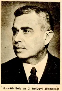 After the war, the new socialist Hungarian government asked Béla Horváth to serve as Interior Minister, but he declined the offer.[3] In 1951, Béla Horváth and family were exiled for several years to Hajdúdorog (Hajdú-Bihar County), but then returned to Budapest. Béla Horváth died in Budapest on 3 October 1978 and was buried at the Farkasréti Cemetery.[3]