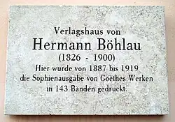 In 1853 the bookseller Hermann Böhlau (1826–1900) founded the publishing house, which would become known for its legal, linguistic and literary-historical works. Its output included Goethe's collected works in 143 volumes (1887–1919). This book series was officially known as Goethes Werke and commonly referred to as the Weimar Ausgabe (WA) of Goethe's works and as the "Sophien Edition", having been named after the patron Grand Duchess Sophie of Saxe-Weimar-Eisenach, the wife of Grand Duke Carl Alexander.
