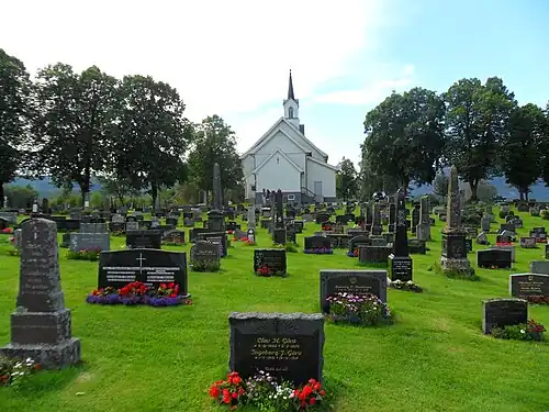 View of the Old Bø Church on the other side of the cemetery -