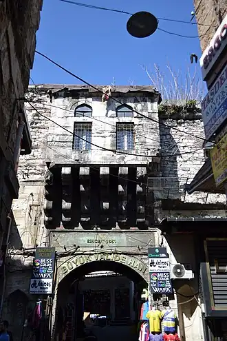 The northeastern corner of the building notably incorporates the substantial remains of a large Byzantine stone tower, though there is still some dispute as to its origin.[2] Known as the Tower of Eirene, it originally stood 27 meters tall and is the only such tower still standing in the city today.[1] In the han's older days the tower's upper chamber was used as a mosque and its lower chamber was used as a weaving mill, but today it is largely disused.[2]