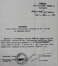 On 22 February 1990, the Moscow based State Design and Prospecting Research Institute for Civil Aviation "Aeroproject"[41][42] confirmed the pavement classification number and indicated the aircraft which may be operated at Bălți-Leadoveni with no restrictions: Il-18, Antonov An-12, Yakovlev Yak-42, Tupolev Tu-134.