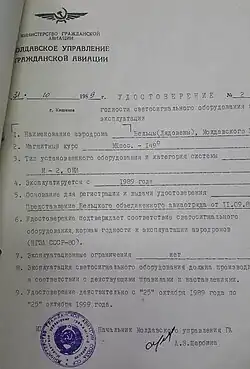 On 8 June 1990, USSR Ministry of Civil Aviation issued Bălți-Leadoveni Certificate No.190 of state registration and aerodrome suitability, confirming the registration of the aerodrome in the USSR State Register of Civil Aerodromes, aerodrome class "B", runway dimensions 2240x42m, 24 cm cement concrete surface type, day and night operation all year round, equipment with non-directional beacons (NDB) as part of the instrument landing system (ILS) on 2 directions, as well as precision approach radar system (PAR) and low intensity runway lights (LIRL) on 2 directions, without weather minima of ICAO landing categories, the ability of unlimited operation of aircraft Tupolev Tu-134, Antonov An-24, Yakovlev Yak-40 and other types of