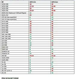 Pavement classification number: PCN 16 R (rigid construction) / A (the strongest class is CBR 15 (all CBR above 13%) of the base strength under the road surface / W (unit expressing the maximum tyre pressure the road surface can withstand, W (unlimited) – no tyre pressure limit) / T (description of method by which the first value was obtained): T denotes technical grade) CONC (concrete).
