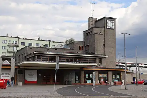 The original station building, constructed around 1859, quickly became inadequate for the needs of the city due to its partly wooden construction and small size. A modern station in the modernist style was designed on an area of 4,800 m² in 1927 by the renowned architect Edgar Aleksander Norwerth, with Stanisław Hempel as the structural engineer.[2] The station building, constructed by the company Pronaszko i Sobieszek, was opened in the spring of 1931, two years behind schedule. Although the design for the station was ready in 1927, a lack of funds and difficulties associated with purchasing private land meant that the building was not opened until 1931.[3][4] For many years, the modernist station building was one of the most representative landmarks of the city. However, later it fell into disrepair. Before 2006, the station was in very poor condition due to many years of neglect and lack of repairs. In the summer of 2006, renovation work began.[3] In the first stage, the roof was repaired, the top of the chimney on the tower was dismantled and rebuilt, and windows and doors were replaced. In the second stage, the installations were replaced. The final stage (2010-2012) included the installation of an elevator, opening the building onto the Warsaw-Vienna Railway Square by enlarging window openings in the west wall, and adapting the ground floor space for rental premises.[5]