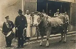 A postcard shows the presentation of a Bœuf Gras de Pâques in Saint-Germain-des-Fossés in 1925.[37]
