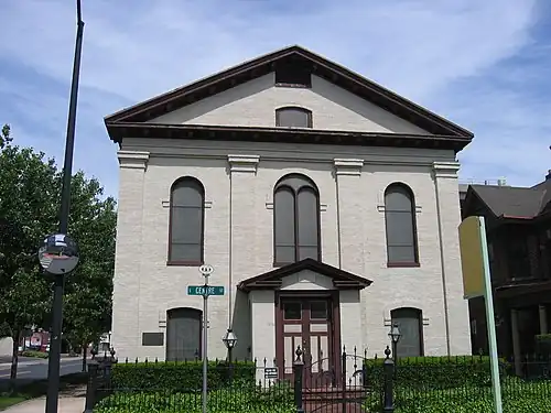 Between 1865 and 1867, the congregation built a two-story, Greek Revival synagogue building on the corner of South Centre and Union Streets. The building cost $7,427.02 to construct.[4] The facade is ornamented with four pilasters, a handsome pediment, and four very un-Greek Rundbogenstil, or round-arched, windows.[10] The building was constructed by local builder John B. Walton.[5]