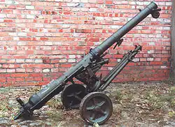 The B-10 recoilless rifle (Bezotkatnojie orudie-10, known as the RG82 in East Germany)[7] is a Soviet 82 mm smoothbore recoilless gun.[8] It could be carried on the rear of a BTR-50 armoured personnel carrier. It was a development of the earlier SPG-82, and entered Soviet service during 1954. It was phased out of service in the Soviet Army in the 1960s and replaced by the SPG-9, remaining in service with parachute units at least until the 1980s. Although now obsolete it was used by many countries during the Cold War.[9][10]