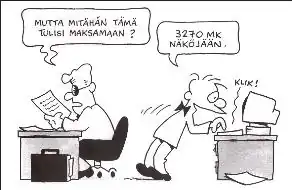 The strip contains some running gags. One example is B. Virtanen filling out a company survey. Criticism is often made impossible because there are only positive or more positive choices to choose from. If there are negative choices the superiors will intimidate Virtanen not to give any "wrong" answers. Another example is the constantly malfunctioning copy machine.