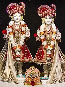 Within the mandir, murtis (sacred images of the deities) have been ritually installed. The central shrine holds the murti of Swaminarayan, with Gunatitanand Swami to his left, together worshipped as Akshar-Purushottam Maharaj. Similarly, other shrines hold murtis of other Hindu deities, such as Radha Krishna, Shiva Parvati, Sita Ram, Hanuman, Ganapati and the lineage of BAPS gurus, who are Swaminarayan's spiritual successors.[3][4] Daily darshan and participation in the Aarti ritual are welcomed by the mandir.[5]