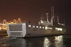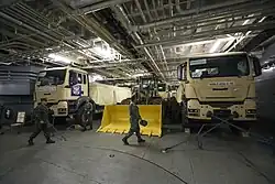 The flight deck of the Pisco has the capability of holding two Sikorsky SH-3 Sea King helicopters of the Peruvian Naval Aviation, while an incorporated hangar can store an additional helicopter.[2] The ship uses a roll-on/roll-off system, and can reportedly transport 450 troops for up to 30 days.[4]