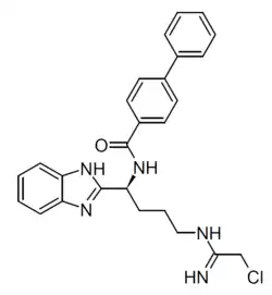 BB-Cl-Amidine is an experimental drug which acts as a non-subtype selective, irreversible inhibitor of the enzyme peptidylarginine deiminase (PAD). It has anti-cancer effects and is useful for various inflammatory conditions such as arthritis, and while it may be unlikely to be developed for human use due to toxicity concerns, it is widely used in scientific research.[1][2][3][4][5][6][7][8] As well as its activity as a PAD inhibitor, BB-Cl-Amidine also inhibits the action of the Stimulator of interferon genes (STING) protein by preventing STING oligomerization and thereby terminating the signalling pathway.[9]