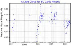 ![]() A visual band light curve for BC Canis Minoris, plotted from data presented by Tabur et al. (2009)[1] | |