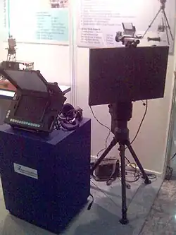 BEL BFSR-SR display at Aero India-2007. The Display unit is seen in the background. This BFSR unit has an integrated Thermal imaging camera on top of the Radar Array. The power battery is suspended from the tripod for added stability. | |