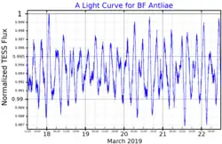 In 2002, Gerald Handler and Robert R. Shobbrook discovered that the brightness of the star varies.[9] It was given its variable star designation, BF Antliae, in 2006.[10] It is an A-type main-sequence star with a stellar classification of A4 V[4] that is at the end of its main sequence lifespan.[6] It is a Delta Scuti variable that varies by 0.01 of a magnitude.[4] These are short-period (six hours at most) pulsating stars that have been used as standard candles and as subjects to study astroseismology.[11] Handler and Shobbrook noted that the star lies near the "hot luminous border of the δ Scuti instability strip", and it appears "multiperiodic with a time scale of 3.8–6 hours".[9]