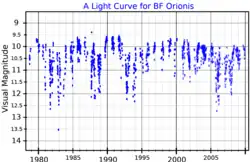 BF Orionis is a Herbig Ae/Be star variable similar to UX Orionis. It is still accreting mass, producing about 2L☉ through the release of gravitational energy, and is surrounded by a massive, optically thick protoplanetary disk of 0.005±0.002M☉[4] visible nearly edge-on. The brightness of the star is strongly variable, with irregular deep minima down to 13th magnitude. The variations are suspected to be partly caused by a brown dwarf or massive planet embedded in the protoplanetary disk,[1] together with very large comets.[8]