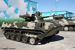 - BMD-2M – BMD-2 modernisation, with the original turret replaced by the Bereg combat module. The main armament is similar to that of the non-upgraded BMD-2, with a 2A42 cannon with 300 rounds, and a PKTM machine gun. However, the original missile system is replaced by two launchers for 9M133 Kornet missiles. A new fire-control system is installed, with a new sight including a thermal channel, a laser rangefinder, a new ballistic computer coupled with a meteorological sensor and with automatic target tracking, and a new stabiliser. A new radio is installed, and three smoke grenade launchers are added.[11]