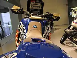 The R 80 G/S (G for Gelände "offroad" in German S for Straße "street") was the first large displacement multisport bike on the market. The G/S was fitted with a 797.5 cc (48.67 cu in) BMW type 247 engine, which is a flat-twin (boxer) sometimes known as an airhead. The engine, which was fitted into an R65 frame,[2] was a modified version of that fitted to the R 80/7, featuring Nikasil cylinders, electronic ignition and a lighter flywheel.[2] At the rear the bike had the new "monolever," a combined single-sided swingarm and drive shaft, with the rear damping provided by a single shock absorber. The monolever was stiffer and lighter than the design fitted to previous models, and was subsequently fitted to other BMW motorcycles. It was a sealed suspension lever with the driveline inside the lever filled with oil to lubricate the shaft and parts.[2] The single sided swing arm enabled the rear wheel to be removed easily with the bike on the center stand. It differs from other BMW road bikes of the same era due to its lighter weight, longer suspension travel, and large 21 inch front wheel.[3] The bike gained popularity with adventure-seeking travellers after having won the Paris–Dakar Rally several times. BMW offered numerous optional parts including a 32-litre (7.0 imp gal; 8.5 US gal) fuel tank with Gaston Rahier's signature, a solo seat, stainless exhaust and a larger battery meaning that for the first time a true adventure travel motorcycle could be purchased directly from a manufacturer. The market it created spawned many aftermarket motorcycle accessories, such as larger fuel tanks and panniers.[3]