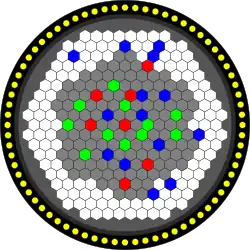 The core is made up of a hexagonal grid containing 265 separate elements, with fuel channels, control rods, various experimental assemblies and a outer section of solid blanket assemblies (blanks).[8] The reactor vessel also has several experimentation channels in the outer hull, with widths varying from 90mm to 230mm.[9]