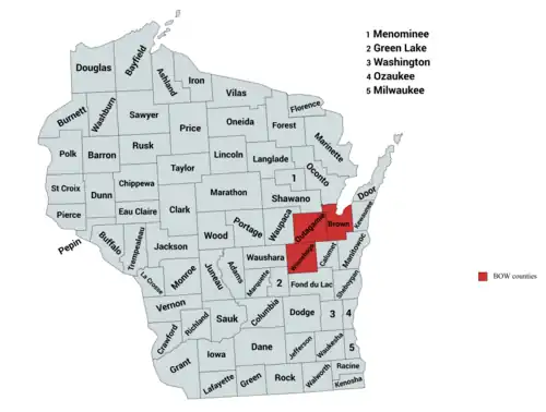 The BOW counties (/baʊ/)[1] are three counties in the U.S. state of Wisconsin: Brown, Outagamie, and Winnebago.[2] The counties stretch from the western shore of Lake Winnebago down the Fox River to Green Bay. Cities in the BOW counties include Green Bay, De Pere, Appleton (part), Kaukauna (part), New London (part), Seymour, Neenah, Menasha (part), Omro, and Oshkosh. Also included is the Oneida Nation of Wisconsin. The region overlaps with the Fox Cities but includes the more populous Brown County,[3] and not Calumet County.[4] The region also excludes the similarly sized Fond du Lac County as it is more solidly Republican and last voted for a Democrat for president in 1964.[5] The term has been in use since at least 2018,[6] but only started being used by mainstream sources in 2020.[7][3]