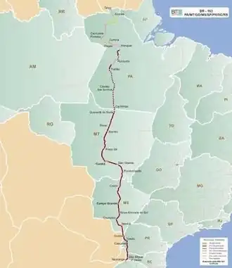 BR-163 is a highway in Brazil, going from Tenente Portela, in the state of Rio Grande do Sul, to Santarém, Pará, on 3579 kilometers (the stretch between Santarem and Brazil-Suriname border is only a project, the highway would have a total size of 4,426.7 km if it were all implemented).[1] It was proposed to pave the road in its entirety part of the Avança Brasil project, which in 2007 was replaced by the Programa de Aceleração do Crescimento. A 51 km long stretch of the highway was finally paved in 2019 in the state of Pará in a cooperation between the Bolsonaro government and the Brazilian army engineering battalion, until the city of Miritituba, leaving only a small part of the highway to be paved on the other side of the Amazon River.[2][3]