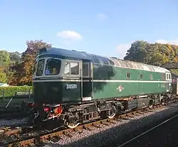 The locomotives were based on the Sulzer Type 2 locomotives that BRCW had built for the Scottish Region of British Railways.[29] The cabs were altered slightly, with the centre section housing a two figure route indicator.[30] They were built at BRCWs Smethwick works. The underframe and bodysides form an integral superstructure. The cabs are double skinned, with driving controls both sides to make shunting easier. The roof is of glass reinforced plastic. Bogies are identical to those used on the Sulzer Type 2, with SKF roller bearings and brakes on all wheels. The handbrake works on the inner set of wheels of each bogie.[31] The engine is a Sulzer 8LDA28 diesel engine, built by Vickers-Armstrong at Barrow-in-Furness, Lancashire. It has eight cylinders of 280 mm bore by 360 mm stroke and develops 1,550 horsepower (1,160 kW) at 750 rpm. A Sulzer de Havilland LAG 37-17 turbocharger is fitted.[32] The main generator is a Crompton Parkinson CG391-B1.[33] The locomotives are fitted with dual air and vacuum brakes and can work in multiple with any other "blue star" locomotives.[34]