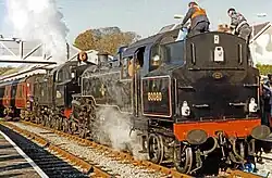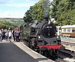 Of the fifteen engines to survive into preservation, only one was purchased directly from BR and this was No. 80002, all the others being purchased from Barry Scrapyard. Of the fifteen engines to be preserved only two members of the class are yet to run in preservation, these being: 80100 and 80150. 80097 has recently been steamed in preservation and entered service in March 2019 following its restoration from scrapyard condition at the East Lancashire Railway.[8] Five of them have also seen mainline operation: Nos. 80002, 80079, 80080, 80098 and 80135. 80002 operated over the former BR system in the 1970s when it appeared at an open weekend in Leeds arriving and returning home from the event under its own power. Three of the class were regular mainline performers around the '90s, with 80080 being originally used on LU 'Steam on the Met' trips. In 1991, steam was to return to the Folkestone Harbour branch with 80080 taking the train down from the mainline to the station at Folkestone Harbour and then for the journey back up to the mainline 80080 was used to bank West Country Pacific No. 34027 Taw Valley.