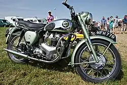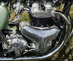 The 495 cc (30.2 cu in) twin cylinder engine produced 26 bhp (19 kW) and was capable of 85 mph (137 km/h).[1] The engine had a long stroke with a bore and stroke of 62 mm × 82 mm (2.4 in × 3.2 in). A single camshaft behind the cylinders operated the valves via long pushrods passing through a tunnel in the cast iron block. This system needed a considerable number of studs and nuts to fasten down the cast iron cylinder head and rockerboxes, many of them deeply recessed and requiring well-made box spanners or the then uncommon sockets. As with other British motorcycles of the period, this kind of set-up regularly led to oil leaks.[4]