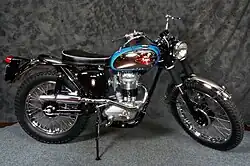 The BSA C15S was the scrambler (motocross) competition version of the 250 cc Star produced between 1959 and 1965. As with the trials model, the C15S saved the weight of a battery through an 'energy transfer' electrical system which was notoriously unreliable.[3] The problem was that the timing and points gap required far too much careful setting for a rugged competition motorcycle. The scrambler C15 shared the same frame as the trials (designated with a C suffix), had a larger exhaust valve, higher compression ratio and modified camshaft for more power. It was unsilenced and had special tyres and strengthened fork springs with rubber fork gaiters to protect the seals.[4]