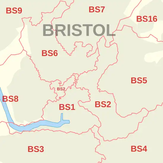 The BS postcode area, also known as the Bristol postcode area,[2] is a group of 37 postcode districts in South West England, within eight post towns. These cover the city of Bristol, north Somerset (including Weston-super-Mare, Axbridge, Banwell, Cheddar, Clevedon, Wedmore and Winscombe) and south Gloucestershire.