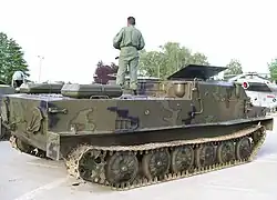 The BTR-50 (BTR stands for Bronetransporter (Russian: БТР, Бронетранспортер), literally "armoured transporter") is a Soviet tracked amphibious armoured personnel carrier (APC) based on the PT-76 light tank chassis.[3] The BTR-50 was developed in 1952 and entered service with the Soviet Army in 1954. It ceased production in the USSR in 1970, but production continued in Czechoslovakia until 1972 and there is suggestion that it still produced by some foreign companies. It has the ability to transport up to 20 fully equipped infantrymen, and can be armed with nothing, a 7.62 mm SGMB medium machine gun, or a 14.5 mm KPV heavy machine gun. It saw notable service in the Six-Day War, the Yom Kippur War, and most recently in the Russo-Ukrainian War.