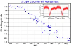 BT Monocerotis (Nova Monocerotis 1939) was a nova, which lit up in the constellation Monoceros in 1939. It was discovered on a spectral plate by Fred L. Whipple on December 23, 1939.[5] BT Monocerotis is believed to have reached mag 4.5, which would have made it visible to the naked eye, but that value is an extrapolation; the nova was not observed at peak brightness[2] Its brightness decreased after the outbreak by 3 magnitudes in 182 days, making it a "slow nova".[6] The light curve for the eruption had a long plateau period.[5]