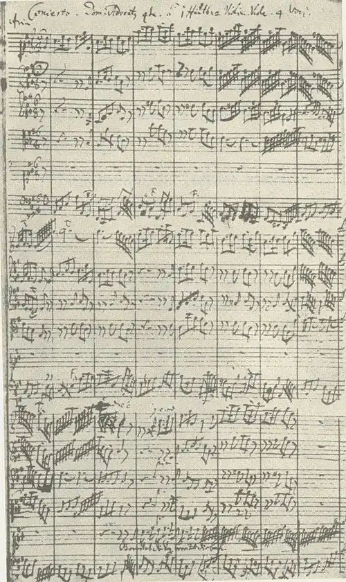 Bach structured the cantata in six movements, alternating arias and recitatives, concluded by a chorale.[4] As in several other cantatas on words by Franck, it is scored for a small ensemble of four vocal soloists (soprano (S), alto (A), tenor (T) and bass (B)), and a Baroque instrumental ensemble of oboe (Ob), two violins (Vl), viola (Va), cello (Vc) and basso continuo (Bc) including bassoon.[4][8] A choir is only needed for the chorale, if at all. The title of the autograph score reads: "Dominicâ 4 Adventus Xsti Concerto. / Bereitet die Wege, bereitet die Bahn. / â 9. / 1 Hautbois. / 2 Violini / 1 Viola / Violoncello. / S:A:T:B: / col Basso per l'Organo / di / GSBach".[9] The duration is given as 22 minutes.[4] The music of the chorale is lost; it may have been noted in a simple setting on a separate sheet, as in the similar case of Nur jedem das Seine, BWV 163, composed four weeks earlier. For practical purposes the same verse, closing Ihr, die ihr euch von Christo nennet, BWV 164, in 1725, may be used.[4][10]
