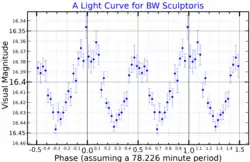 BW Sculptoris is WZ Sge-type dwarf nova and a candidate period bouncer. The binary consists of a white dwarf and a brown dwarf donor that orbits the white dwarf every 78.23 minutes. BW Sculptoris is one of the closest and brightest cataclysmic variable stars with a brightness of magnitude 16.5 and a distance of 93.3 parsecs. It also has the shortest period for any CVs known to date (as of August 2023).[1]