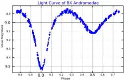 BX Andromedae (BX And) is an eclipsing binary star in the constellation Andromeda. Its maximum apparent visual magnitude is 8.87. Within a cycle of approximately 14.6 hours, the brightness drops down to a magnitude of 9.53 during the main eclipse, and to a magnitude of 9.12 during the secondary one. It is classified as a Beta Lyrae variable.[3]