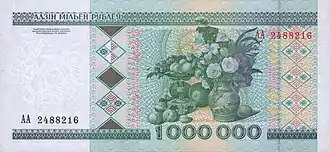 Rbls 1,000,000 | Sky-blue | The National Museum of Arts of Belarus in Minsk | Fragment of the picture "Portrait of wife with flowers and fruits" by I. Khrutski | 30 April 1999 | ||||