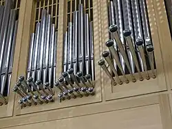 The center was designed in partnership with Frank Ferguson of FFKR Architects (Salt Lake City)[40] and by Brazilian-Israeli architect David Resnick,[41] who also designed the nearby campus of the Hebrew University. The center is situated on the western slope of the Mount of Olives, right where it connects to Mount Scopus, overlooking the Kidron Valley and the Old City. The 125,000-square-foot (11,600 m2), eight-level structure is set amid 5 acres (2.0 ha) of gardens. The first five levels provide dormitory and apartment space for up to 170 students, each of these apartments having a patio overlooking the Old City. The sixth level houses a cafeteria, classrooms, computer facilities, and a gymnasium, while administrative and faculty offices are located on the seventh level, along with a 250-seat auditorium. The main entry is on the eighth level, which also contains a recital and special events auditorium with organ, lecture rooms, general and reserve libraries, offices, a domed theater, and a learning resource area.[42] This auditorium is surrounded by glass on three sides, providing views of the city. The organ within it is a Scandinavian-made Marcussen organ. The aforementioned library on the same floor as the auditorium contains 10,000-15,000 volumes focusing largely on the Near East.[28]
