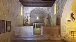 Several evidences show that the tablet is dated to the late 11th or early 12th century (c. 1100 CE).[1][2] The tablet's content suggests it was inscribed after the death of King Zvonimir (who died in 1089), since abbot Držiha describes Zvonimir's donation as an event that happened further in the past ("in his days").[1] The Church of St. Lucy, described as having been built during the reign of count Kosmat (possibly identified with župan of Luka in 1070 or comes Kuzma who was in the entourage of Coloman, King of Hungary to Zadar in 1102[9][10]) who ruled over whole Krajina (probably a reference to a local place on island of Krk or March of Dalmatia from the 1060s which was composed of part of Kvarner and the eastern coast of Istria[9][10]), suggests the period of Croatian succession crisis of the 1090s and before the Venetian domination since 1116 and first mention of counts of Krk in 1118–1130 (later known as Frankopan family).[1][2] Lujo Margetić considered it was erected by the same counts of Krk between 1105 and 1118.[11] Desimir is identified with Desimir župan of Krbava mentioned in the 1078 charter of king Zvonimir, while Pribineg some scholars identified with Pirvaneg župan of Luka in 1059.[2] Ornamental decoration of the tablet, and early Romanesque (11–12th century) features of the church of St. Lucy similar to three other churches founded by 1100 on Krk also show it is dated at the turn of the 11th and 12th centuries.[1][2] Lately art historian Pavuša Vežić argued that the church is dated to the late Romanesque period (in the beginning of the 14th century) and Baška tablet text to 1300 with only ornamental decoration from 1100.[12][13] Although new dating of the church was accepted by scholars like Margetić, they still considered it does not change the early 12th century dating of the whole tablet which features are "hardly possible" for the middle of the 12th century and "unimaginable" for the beginning of the 14th century.[14]