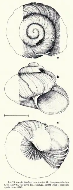 Alan Solem, the curator of invertebrates at the Field Museum of Natural History, created the genus Ba for his newly-described species B. humbugi.[2] Solem based his description of the type species B. humbugi on a holotype which the American malacologist Yoshio Kondo had collected in 1938 and three paratypes. One paratype was deposited in the Field Museum; the remaining specimens in the type series were deposited in the Bishop Museum.[5]