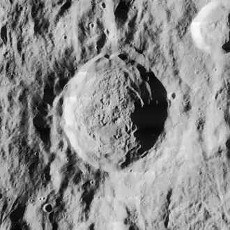 This crater lies within the Mendel-Rydberg Basin, a 630 km wide impact basin of Nectarian age.
