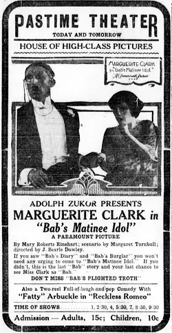 Bab's Matinee Idol is a 1917 American silent romantic comedy film, based on the Mary Roberts Rinehart novel Bab: a Sub-Deb, produced by Famous Players–Lasky, and directed by J. Searle Dawley. This was the final film in the trilogy of Babs films that starred Marguerite Clark.[1]