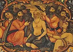 ![]() Cover from a lacquer mirror case with multiple scenes, school of Mohammad Esmail Esfahani; the top scene depicts Baba Tahir with disciples. Created in Qajar Iran, dated c. 1855-60 | |
