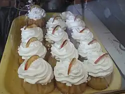 A rum baba or baba au rhum is a small yeast cake saturated in syrup made with hard liquor, usually rum, and sometimes filled with whipped cream or pastry cream. It is most typically made in individual servings (about a 5 cm tall, slightly tapered cylinder) but sometimes can be made in larger forms similar to those used for Bundt cakes. The batter for baba includes eggs, milk and butter.