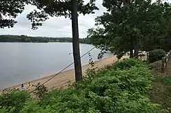 Babb's Beach is located in northwestern Suffield, on the eastern shore of the Middle Pond of the Congamond Lakes, which separate Suffield from Southwick, Massachusetts. The property is about 7 acres (2.8 ha) in size, and has 375 feet (114 m) of shoreline that is mostly beaches. The beach is separated from the balance of the property by a low bluff. The remainder of the property is an open grassy area, with the surviving buildings of the amusement park era on the northern edge. A split-rail fence separates the property from the road, with an opening and a short gravel drive leading to an informal parking area.[2]