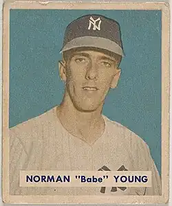 Norman Robert Young (July 1, 1915 – December 25, 1983) was a professional baseball player. He played all or part of eight seasons in Major League Baseball for the New York Giants (1936, 1939–42 and 1946–47), Cincinnati Reds (1947–48) and St. Louis Cardinals (1948), primarily as a first baseman. He was a member of the Giants' 1936 National League pennant-winning team.