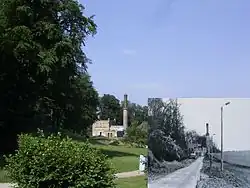 The steam-powered pump house in Babelsberg Park / Today and before 1989 with the border wall (photo montage)